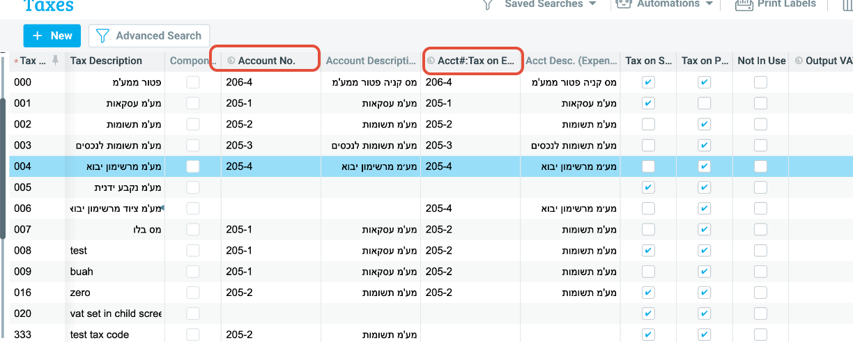 To ensure Dokka successfully pulls the VAT types defined in Priority, you must assign a VAT account to each type in both the "Account no." and "Tax on Expanse" columns.