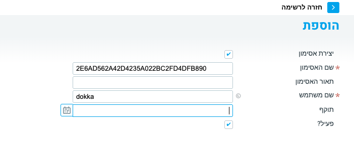 בחלון שייפתח, יש ללחוץ על כפתור ״חדש״, ולאחר מכן לסמן סימון וי בשדה ״יצירת אסימון״ ולבחור את המשתמש שיצרתם עבור דוקה בשדה ״שם משתמש״.