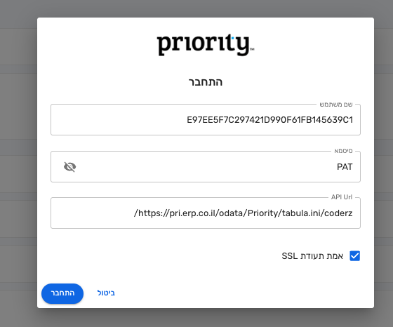שימו לב: אם החיבור לפריוריטי מתבצע דרך SSO/IDP ולא דרך שם משתמש וסיסמא, או במקרים בהם ההתחברות לפריוריטי מתבצעת על בסיס כתובת מייל ולא על בסיס שם משתמש, תצטרכו להגדיר ״אסימון אימות לממשקי REST״ על פי ההנחיות בחלק ״אימות עם SSO״ במאמר הזה, לאחר הקמת המשתמש.