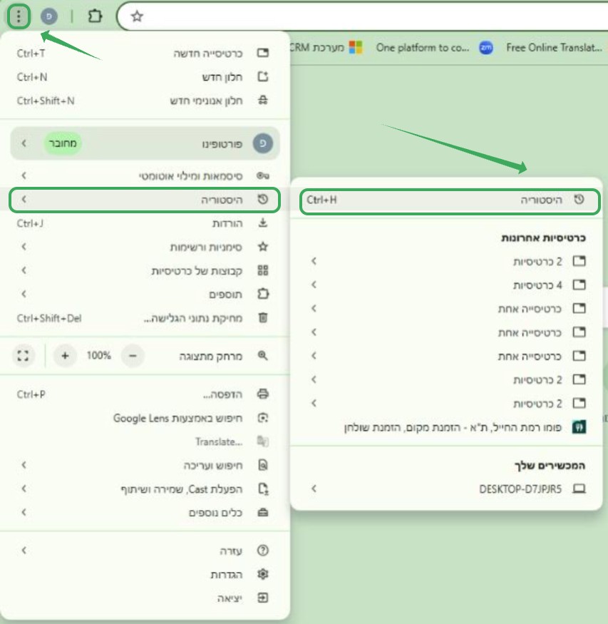 1. לחצו על כפתור התפריט (שלוש נקודות) > היסטוריה > היסטוריה