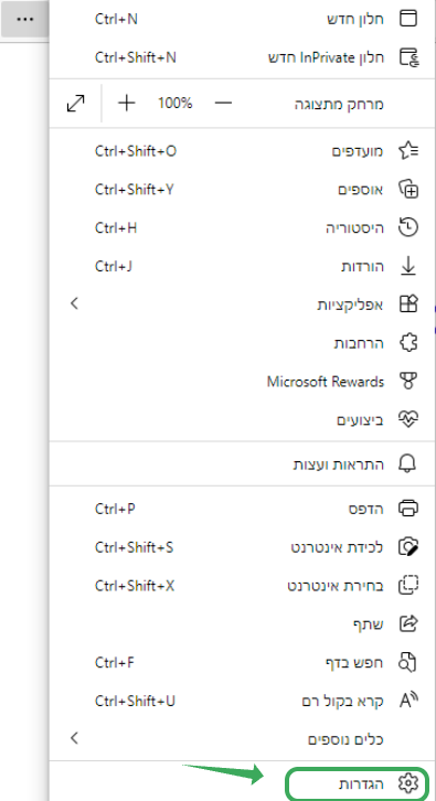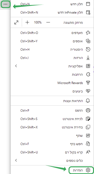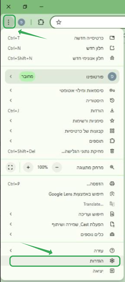 1. לחצו על כפתור התפריט (שלוש נקודות) בפינה השמאלית העליונה של חלון הדפדפן, ואז בחרו הגדרות.
