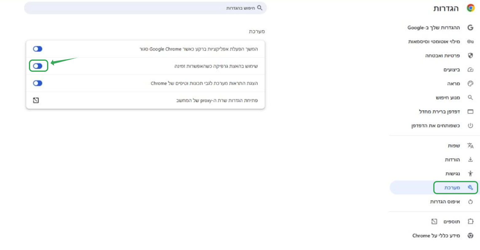 3. אם הבעיה ממשיכה, יש לכבות את ההגדרה “שימוש בהצגת גרפיקה” (Google Chrome) או “שימוש בהאצת חומרה” (Microsoft Edge).