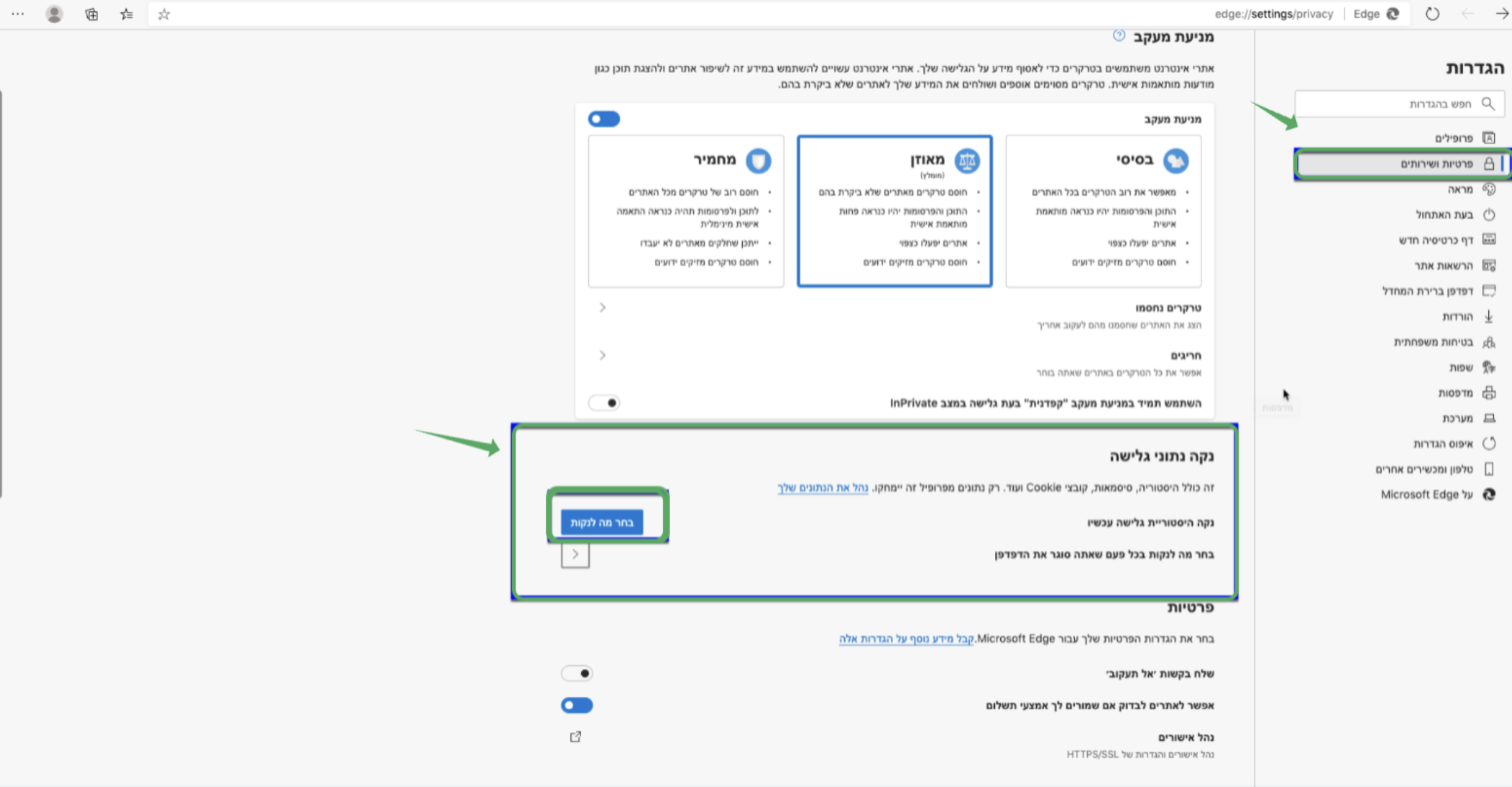 2. במסך ההגדרות,לחצו על ״פרטיות ושירותין -> נקה נתוני גלישה -> בחר מה לנקות
