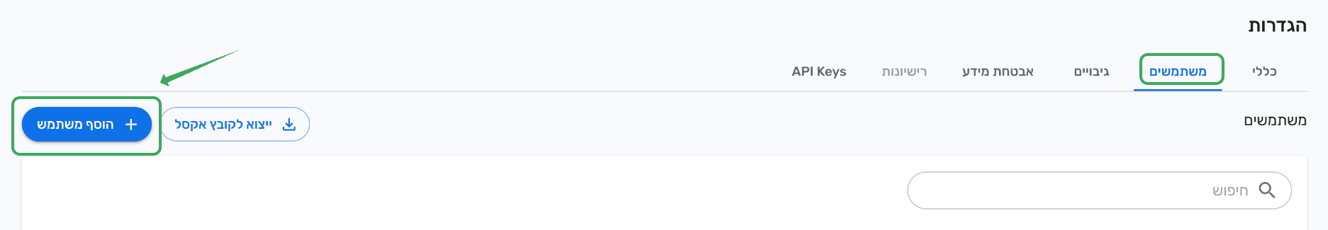 לפתיחת משתמשי ספק, יש להיכנס לארגון (המסך בו מופיעה רשימת החברות) > הגדרות> משתמשים > הוסף משתמש >